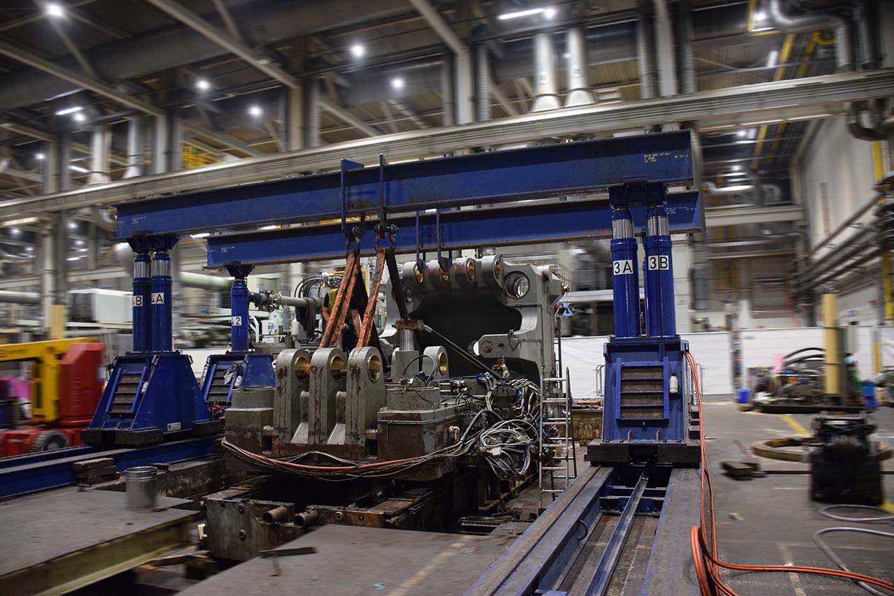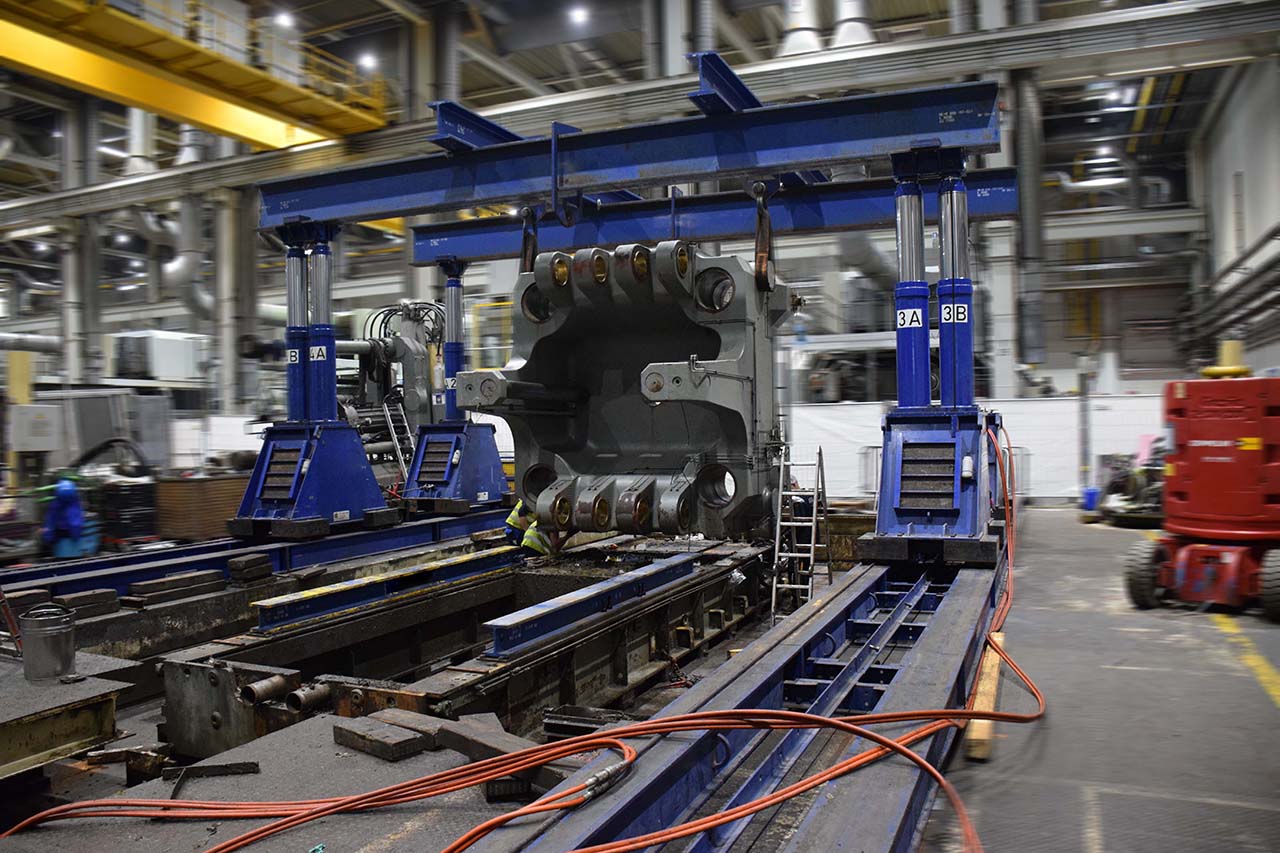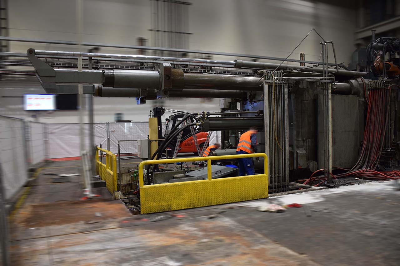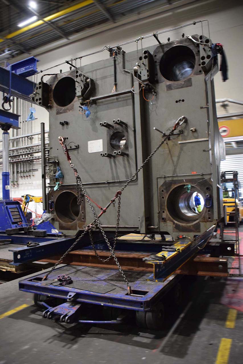 Agora era tempo para a fase de planeamento do complexo desmantelamento e deslocalização das duas células de fundição. Também aqui, as máquinas fiss prestaram um valioso apoio com os seus 30 anos de conhecimentos especializados. Em conjunto, foram analisados os problemas específicos que poderiam surgir durante o desmantelamento e o transporte e foram elaboradas soluções sensatas. O percurso a partir das instalações da fábrica apresentou um desafio particular. A Bühler Evolution B 420 D tem um peso total de 270.000 kg. O desmantelamento e remoção dos componentes pesados da máquina foram correspondentemente complicados. A placa do cilindro com um peso total de 73.000 kg só pôde ser deslocada depois de a entrada com uma cave ter sido fixada com 100 adereços de solo.
