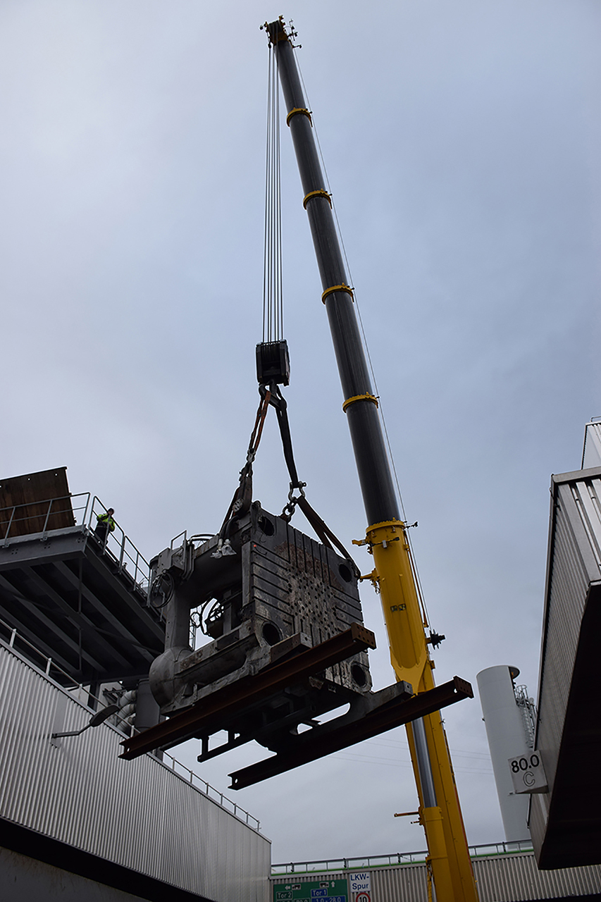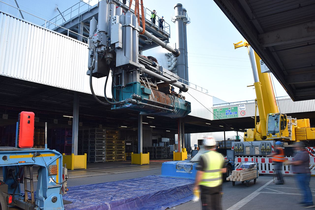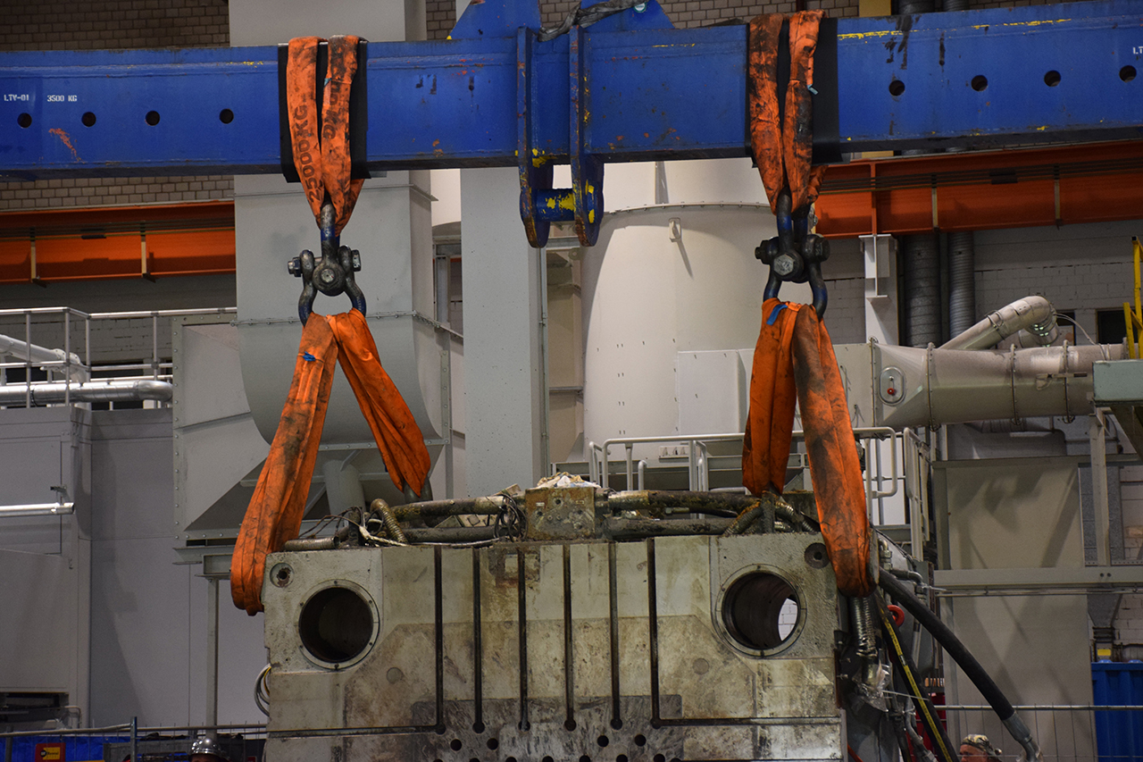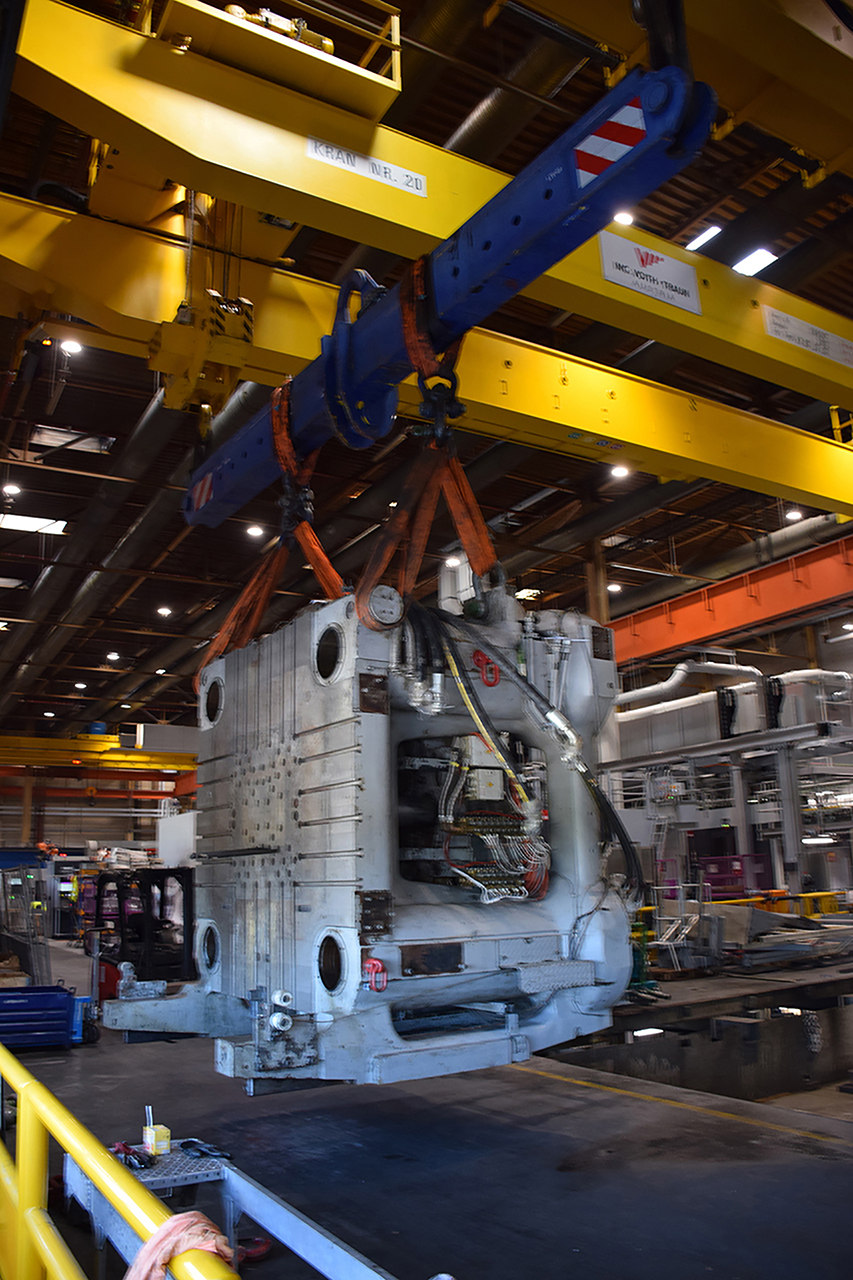 Antes da transferência das células de fundição usadas, o desmantelamento complexo entrou numa extensa fase de planeamento. As máquinas fiss tem 30 anos de experiência bem fundamentada e é um parceiro fiável para todas as partes envolvidas, planeando com previdência e prestando atenção a cada detalhe. Tanto o desmantelamento como o transporte subsequente são analisados em pormenor e com antecedência. O planeamento do projecto inclui sempre uma estratégia individual para uma implementação bem sucedida. Para este fim, foi necessário planear a desmontagem para cada máquina usada individualmente. Por exemplo, o desmantelamento da primeira célula de fundição teve lugar em Agosto de 2021, e a segunda fase estava agendada para Novembro de 2021. Para a remoção das máquinas de fundição sob pressão Buhler Carat 280, este projecto exigiu a concepção da remoção dos componentes pesados através de uma plataforma no 3º andar, com a peça mais pesada a pesar 43 toneladas.